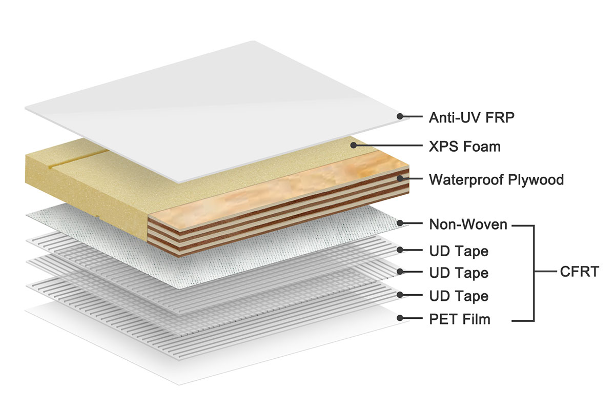 - 내부 레이어: 1.2mm CFRT 시트. (맞춤형: 0.7-2.0mm)