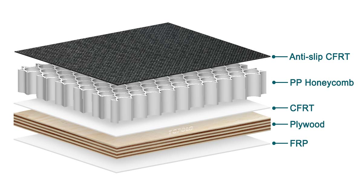 - 램프 도어 상단 패널은 표면에 미끄럼 방지 질감이 있는 미끄럼 방지 열가소성 벌집 샌드위치 패널로 만들어져 경사면을 오르내리는 동안 사람이나 물건이 미끄러지거나 굴러가는 것을 방지합니다. 금속, 대나무 또는 목재 미끄럼 방지 플레이트에 비해 미끄럼 방지 효과가 더 좋고 내구성이 더 좋습니다.