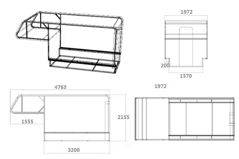 - 외부 크기: 4763x1972x1972mm 또는 맞춤형.