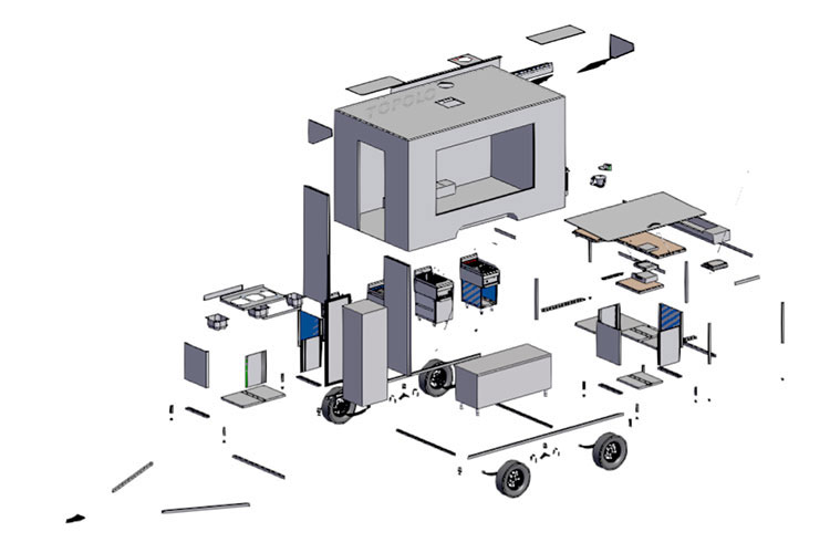 TOPOLOGROUP은 푸드 트레일러를 모듈화하여 신속하게 조립 및 분해할 수 있습니다. 따라서 CKD(완전 녹다운) 또는 SKD(반 녹다운) 형태로 현장으로 운송할 수 있어 사용자가 더 간단한 방법으로 조립하고 자신이 선호하는 스타일에 따라 수정할 수 있습니다.